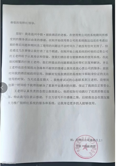 您好!我是温州中联·丽致酒店的老板,在使用贵公司的系统期间所感受到的服务表示由衷的感谢,在刚开始使用贵公司的系统我这边还在考虑后期的售后问题和期间员工使用的问题,会不会时间久了就没有任何支持了,但是通过几次事情让我打消了这个顾虑。在刚开始上线系统的时候经过贵公司的王老师给予认真培训和答疑,使我们酒店前台能够熟练的使用系统,在此期间频繁的打扰王老师,我们所提出的间题都能及时帮忙回复和解决,并且王老师也没有展现出急躁和不耐烦的情绪让我很是放心贵公司的服务。前段时间我的酒店被政府征用,刚解封发现我酒店的系统制卡和刷身份证无法使用的时候,当天还是星期天,我抱着试试的心态联系到王老师,没想到他第一时间给予我帮助解决了重新开业遇到的问题,保证了我酒店正常营业。