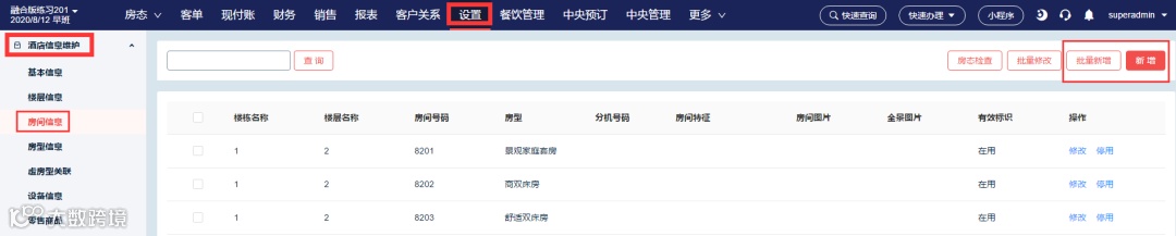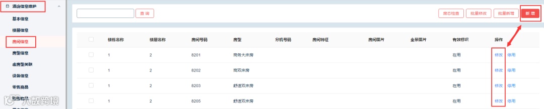 步骤三:设置-房间信息-新增房间/修改房间应用此房型(修改房间的前提:房间无预订单、无在住单占用、无锁房、无维修计划)