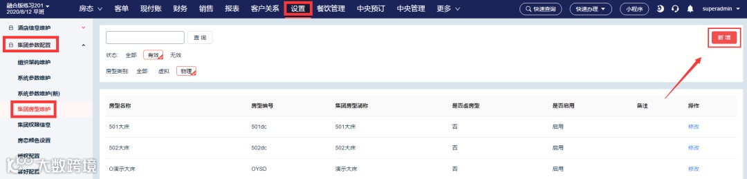 步骤一:设置-集团参数配置-集团房型维护-新增(房型名称、名称缩写、房型编号为必填项,且不可和其他房型信息有重复)