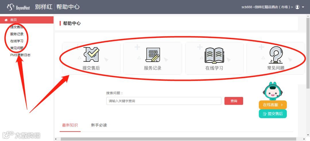登录别样红云PMS,点击网页右上方的黄色按钮“帮助中心”即可进入。