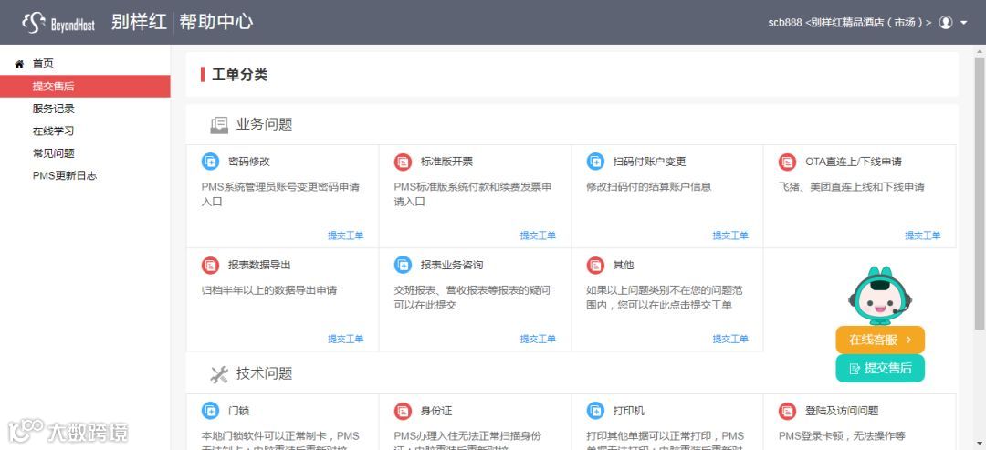 此模块为别样红云PMS用户提交问题工单的通道。您可以通过“提交售后”反映问题,我们售后的小伙伴将及时为您解答。