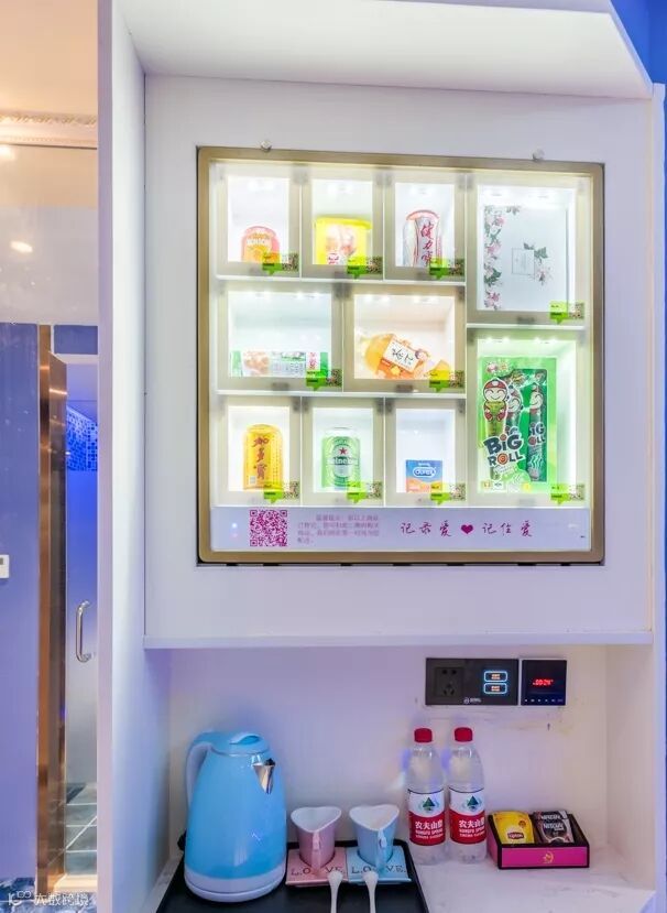 每间客房里都有个自助售卖机。客人手机扫码支付,小商品就会弹出来,科技感满满!