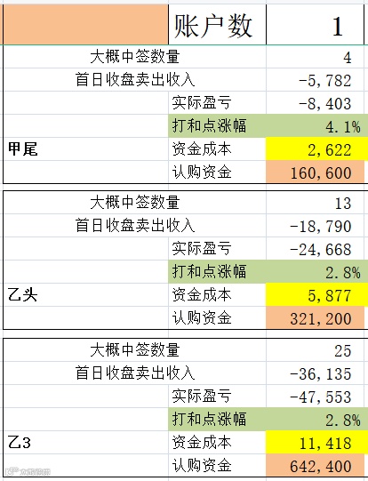打和点这次还很低,毕竟人少中签数量就多,乙组乙头打和点至少要2.8%,甲尾成本到4.1%,按照这次-8%的跌幅来算,带上利息一个甲尾亏损大约在六千左右,一个乙头亏损在2.4万。毕竟中签数量多,-8%虽然跌幅不大,不过也比较多了。