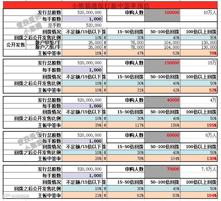 顺丰房托(02191.HK)如果按照4万人参与认购,如果回拨30%,大概 100%左右的一手中签率;如果不回拨,假如按照2万人来算,一手中签率也有78%!
