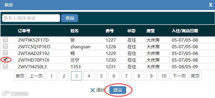 查看需关联住房的【宾客详单】,选择【新建联房】,在联房弹框中勾选需关联的房间,点击【提交】即可。