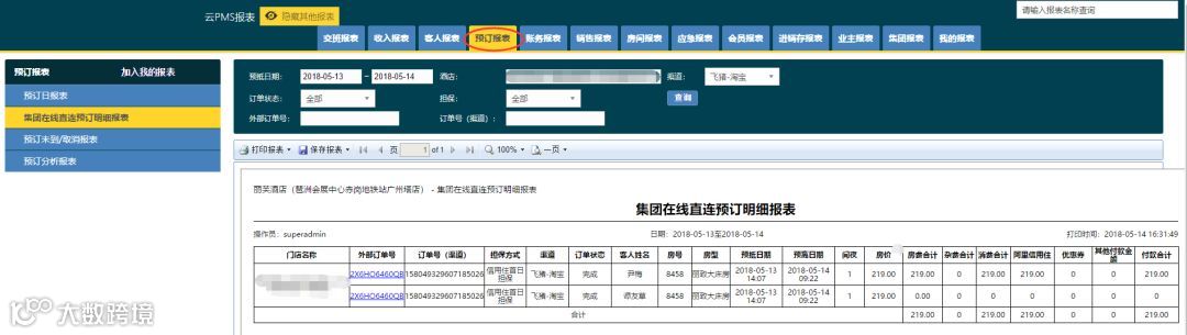 打开【报表中心】,选择【预订报表】-【集团在线直连预订明细报表】,该报表可通过对日期、酒店、渠道等多种信息筛选,查看渠道预订明细。查看飞猪订单,只需将渠道筛选为飞猪或者淘宝即可。