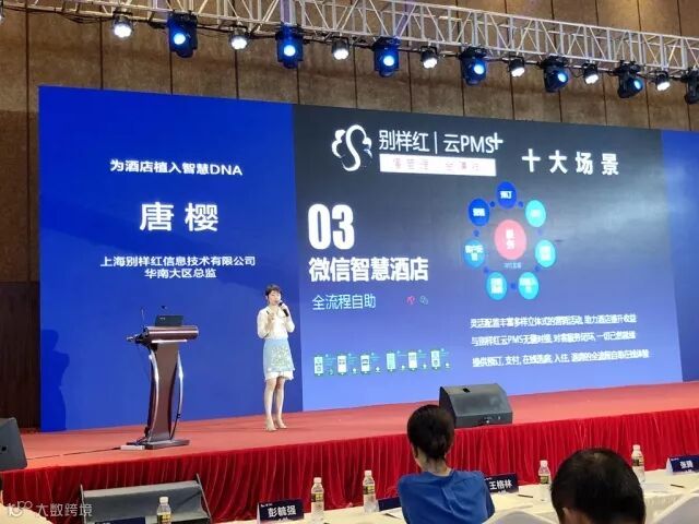 上海别样红信息技术有限公司华南大区总监唐樱,以《为酒店植入智慧DNA》为主题进行了演讲,深入浅出地介绍了别样红云PMS是如何将科技创新技术结合到酒店场景中,助力酒店智慧升级的。