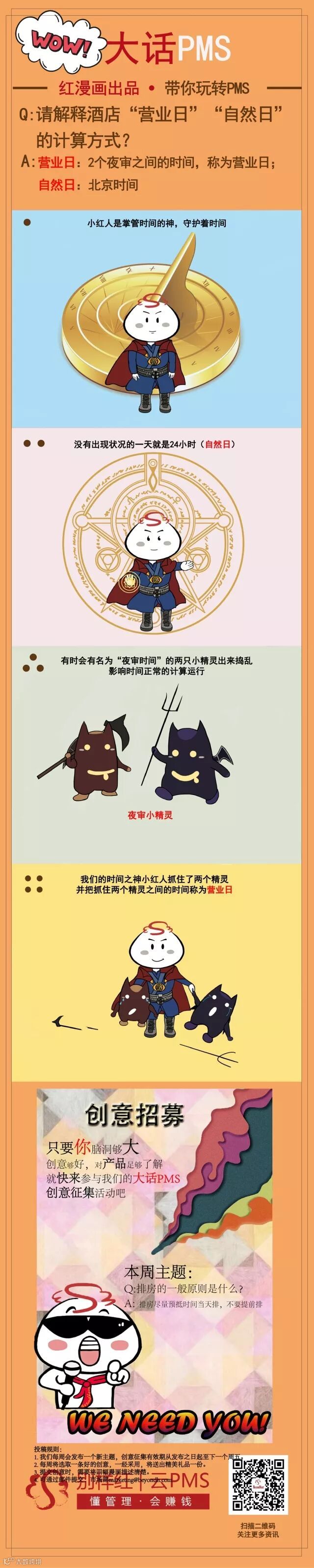 同时,漫画的主角“小红人”将带领商户聚焦使用中的常见问题,如:自用房和免费房的作用和区别,订单取消与NoShow之间的区别,酒店“营业日”和“自然日”的计算方式等话题,从而帮助商户们更好地理解云PMS产品的操作与应用。
