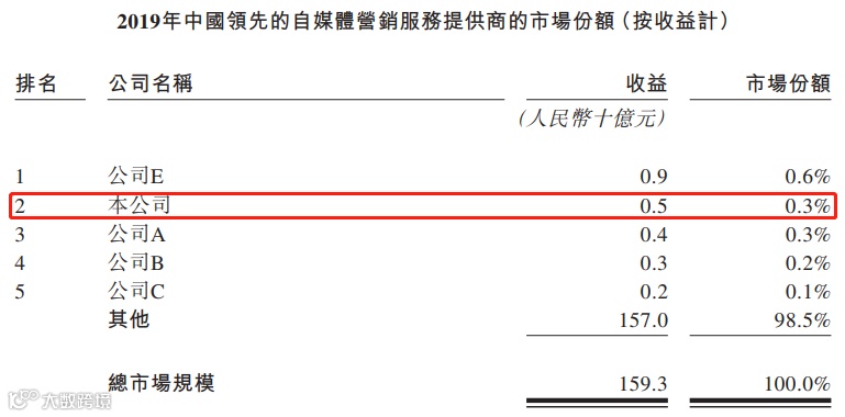 以2019年收益計,自媒體營銷市場規模約佔移動廣告市場總額的三分之一。以收益計的自媒體營銷市場規模由2014年的人民幣162億元增加至2019年的人民幣1,593億元,複合年增長率為57.9%,並預計於2024年前達到人民幣3,648億元, 2019年至2024年的複合年增長率為18.0%。儘管效果類營銷按2019年收益計僅佔自媒體營銷市場的20.0%,但效果類營銷具有高增長潛力,因為其一般是比非效果類營銷更有效率和效果的營銷工具,因此,預期日後效果類營銷服務將佔據更多市場份額。