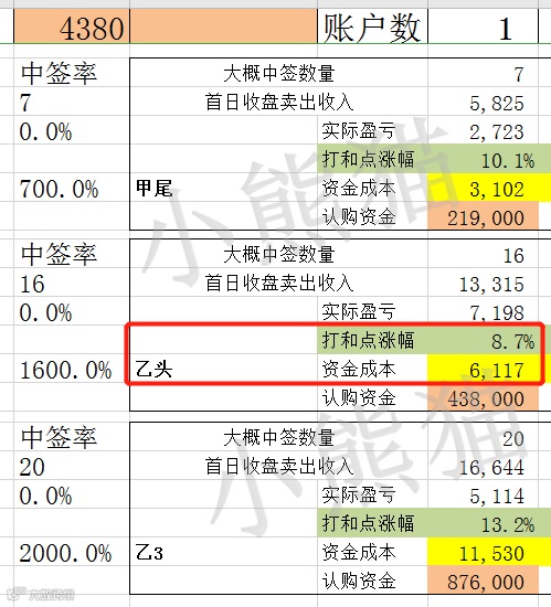 乙组比较好的好的情况是1%的中签率,那就是20手,9万的市值,这是理想情况下,如果比较热,6万多的市值15手应该会有,预估15-20手这个区间吧,按照3.5%的利息算,按乙头16手来算打和点在8.7%左右。