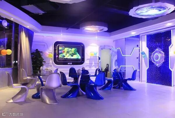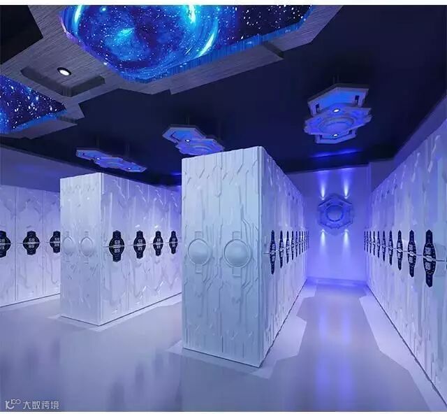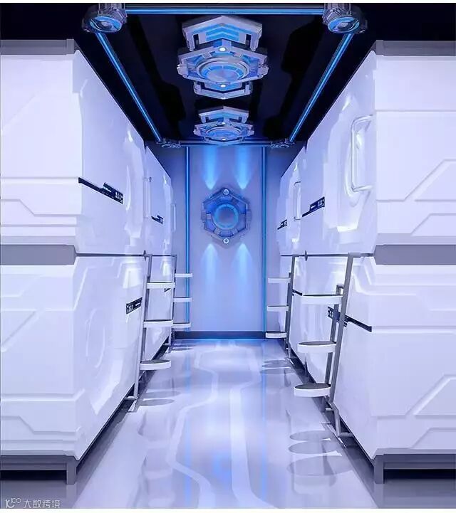 蓝色灯光下笼罩着一股神秘感的长廊,科技感爆棚的装饰和图案,甚至连床位都变成了一个个独立的太空舱,一恍惚已然置身于太空中了。