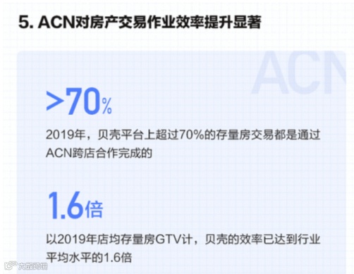 ACN对房产交易行业作业效率有显著提升作用,根据招股书披露,2019年贝壳平台上超过70%的存量房交易都是通过ACN跨店合作完成的。以2019年店均存量房GTV计,贝壳的效率已达到行业平均水平的1.6倍。
