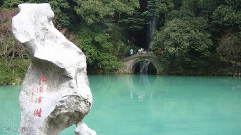 黄龙吐翠 位于西湖北山栖霞岭北麓。清代“杭州二十四景”中有“黄龙积翠”一目,“黄龙吐翠”景名脱胎于此,用一“吐”字,突出贴泉池巉崖间龙口喷水,珠帘倒挂的特有情景。黄龙洞山门到二门之间,有一段长而曲折的游步道,古木修篁,花草清池,颇多可赏景物。