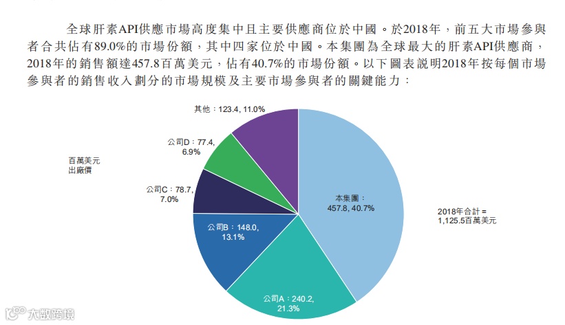 凭借其先进的供应链管理、专有生产技术和领先的设施,公司主要领先药物Inhixa、Neoparin和Prolongin是三种不同的依诺肝素钠注射液品牌,已合共在34个国家获批并在17个国家销售。亦已向14个其他国家的客户供应依诺肝素钠注射液,并是唯一一家在欧盟累计销售超过100百万剂依诺肝素钠注射液的中国制药公司。根据弗若斯特沙利文的数据,按2019年全球销售额计,公司是中国最大及全球第三大依诺肝素钠注射液生产商及销售商,占据6.5%的全球市场份额。
