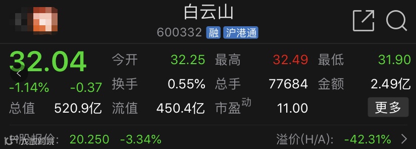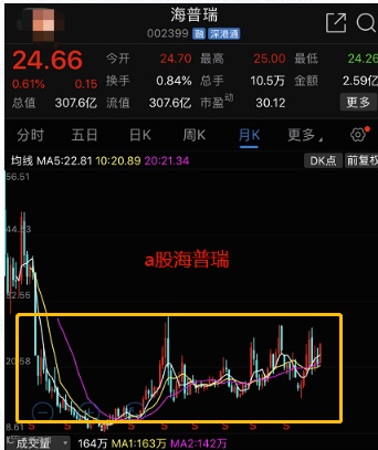 A股:最新价:24.66人民币/股,根据香港银行实时汇率计算得27.02港币/股;总市值:307.6亿元。