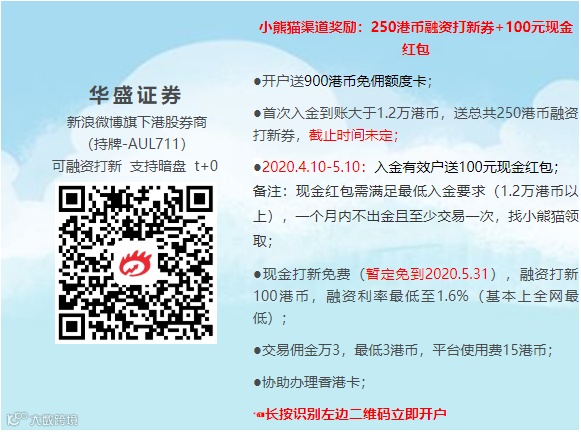 首次入金大于1.2w港币送总共250港币融资打新券,截止时间未定;