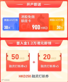 ①开通账户即可免费享有900港币免佣额度卡,融资打新送250元融资手续费券;