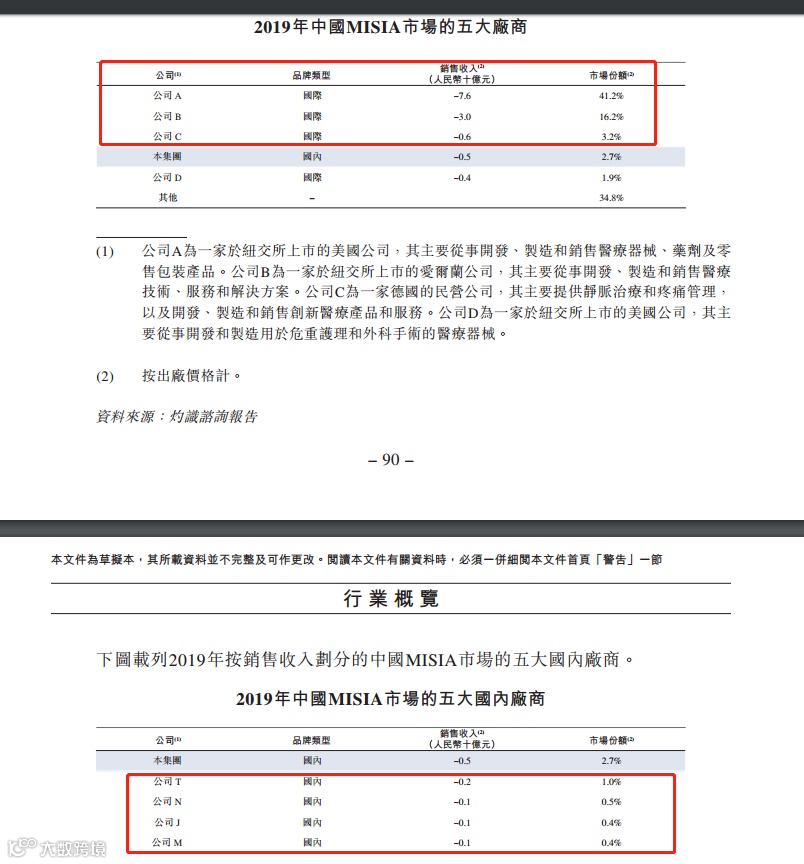 康基医疗是中国最大的国内微创外科手术器械及配件(MISIA)平台。根据灼识咨询的数据,按销售收入(1)计,2019年中国的MISIA市场规模达到人民币185亿元,公司在国内厂商中排名第一,在所有厂商(包括国际和国内厂商)中排名第四,所占市场份额为2.7%。