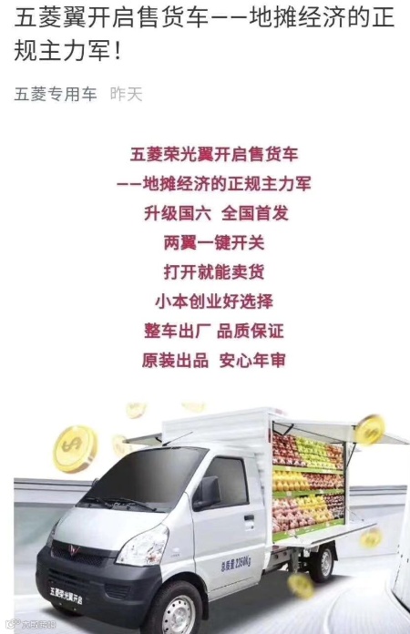 五菱汽车自称:“作为广大的微创业者来说,五菱荣光翼开启售货车,打开车厢即可卖货……让你创业路上更有底气!”