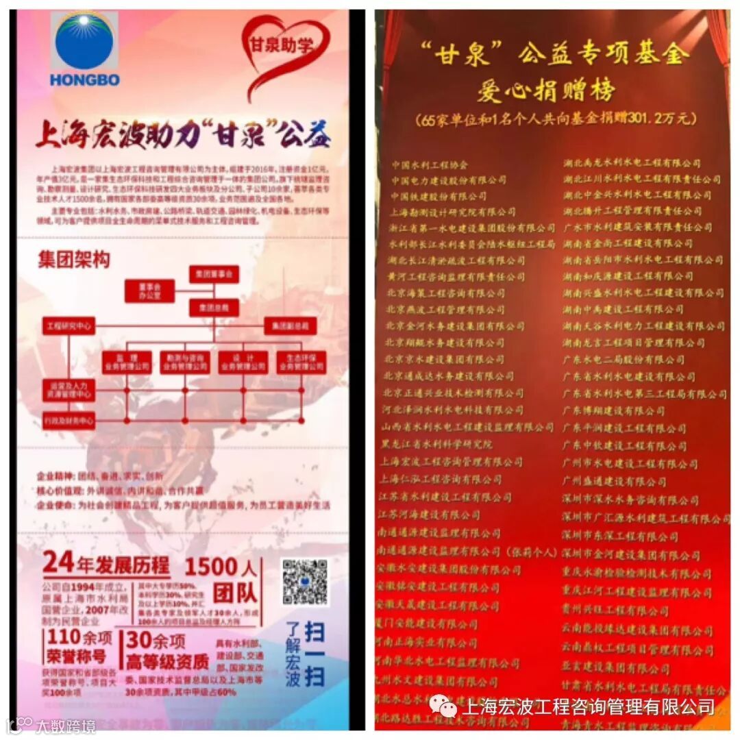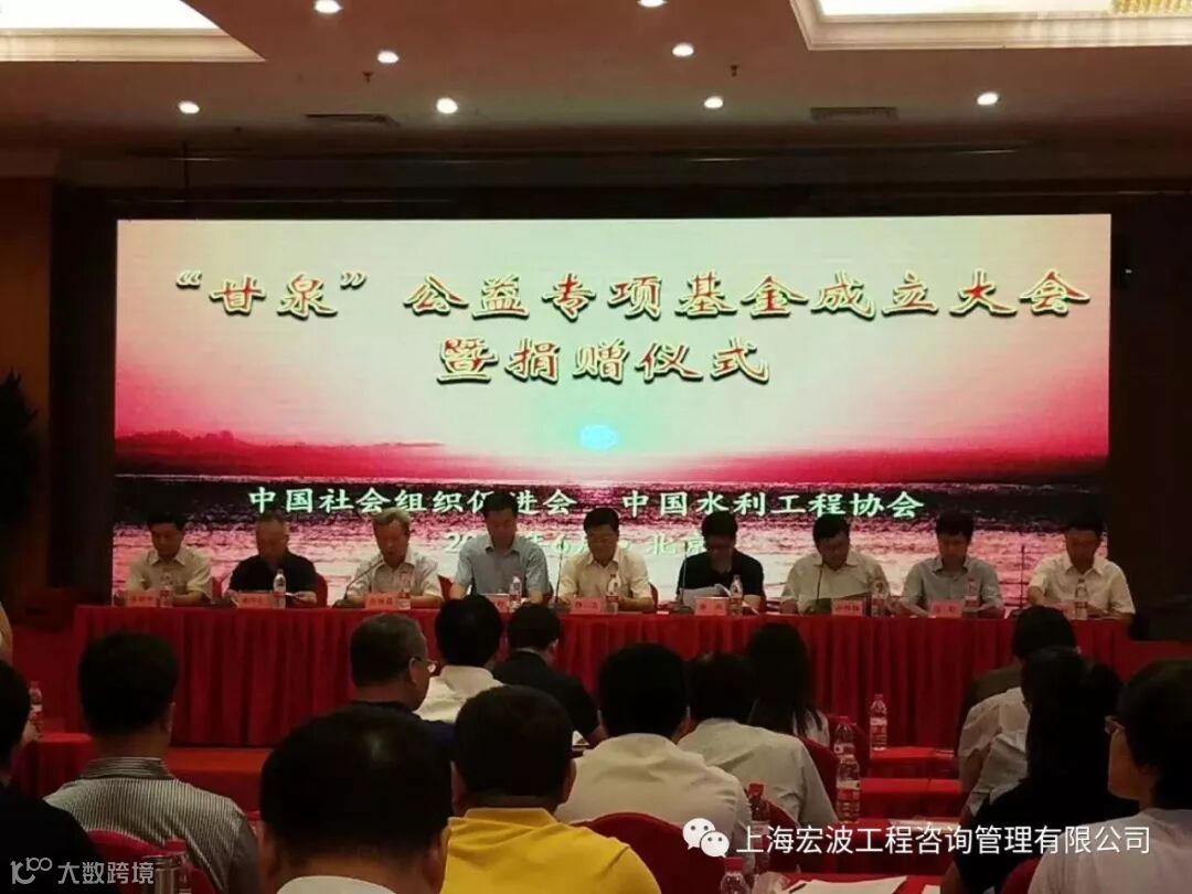 上海宏波工程咨询管理有限公司作为中国水利工程协会常务理事单位和热心社会公益事业的民营企业,公司领导对此项基金非常重视,由总经理李松、副总经理吴红梅出席成立大会暨捐赠仪式,并为基金捐赠8万元,以承担应有的社会义务和向“甘泉”公益事业奉献一份爱心。