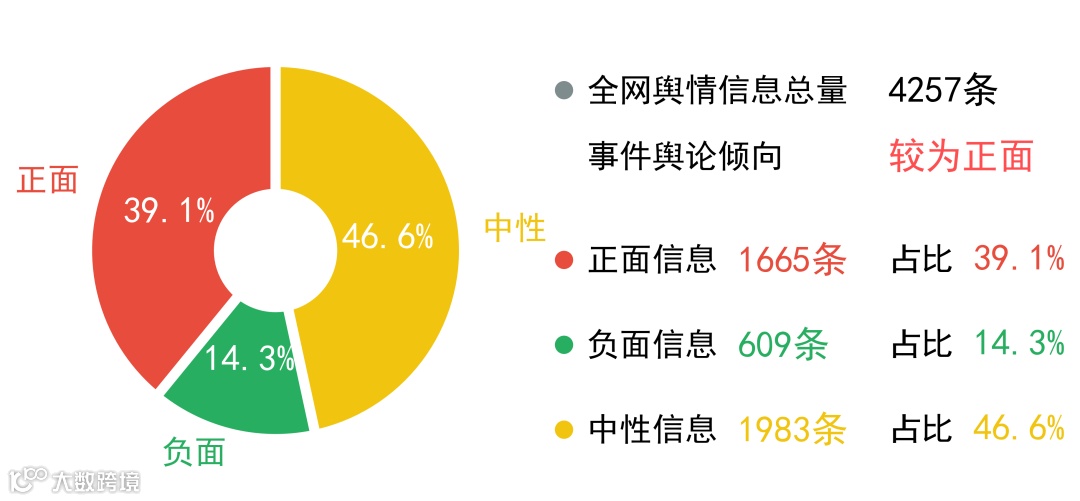 截止08月22日,此事件匹配的全网舆情信息总量为4257条,正面信息1665条,占比39.1%,负面信息609条,占比14.3%,中性信息1983条,占比46.6%,事件舆论呈现出较为正面的倾向。