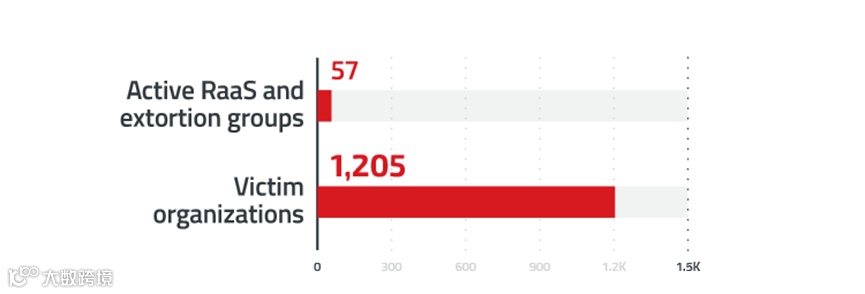 活跃的RaaS和勒索组织数量(57个) VS. 受害组织数量(1205个)