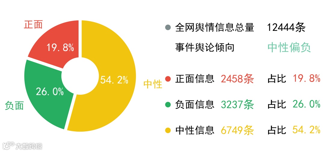 截止08月26日,此事件匹配的全网舆情信息总量为12444条,正面信息2458条,占比19.8%,负面信息3237条,占比26.0%,中性信息6749条,占比54.2%,事件舆论呈现出中性偏负的倾向。