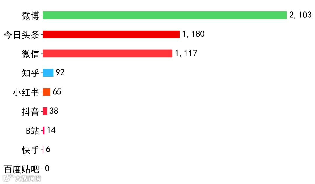 该事件全网传播篇次为10731条,事件主要传播渠道为微博平台,传播篇次2103条,占比19.60%。