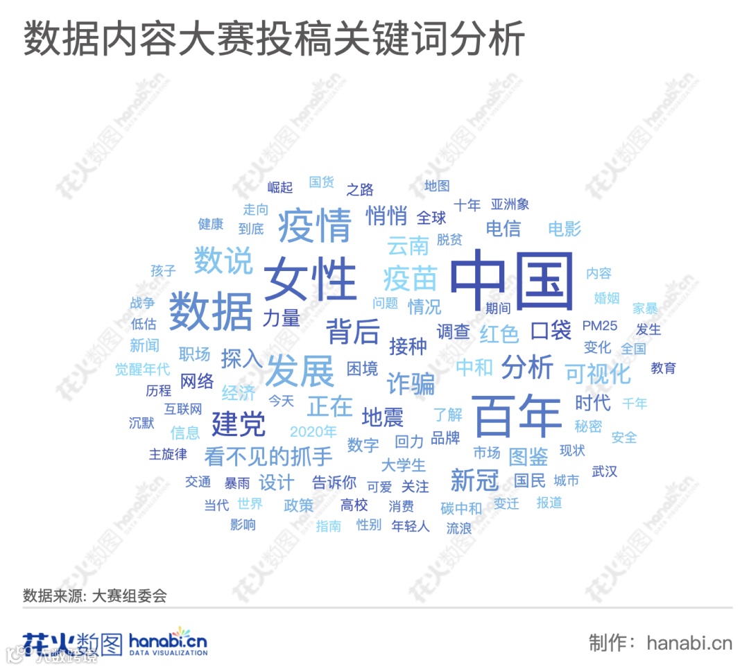 根据投稿关键词分析,今年作品聚集于建党百年,女性发展等相关领域。疫苗、疫情、电信、政策等与时事相关的领域也均有涉及。