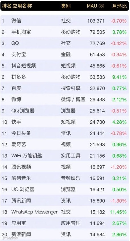 2020年10月移动互联网全行业排行榜,按月活跃用户数排名,前20名的APP中,全都是老面孔。