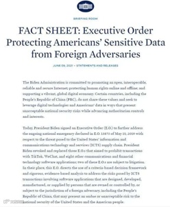 据白宫网站消息,美国总统拜登当地时间6月9日签署一道新行政命令,撤销前总统特朗普在任期间对TikTok和Wechat的禁令,并要求商务部对外国“对手”控制的应用程序,进行更广泛的安全审查。白宫网站介绍称,拜登在一项新的行政命令中,宣布撤销几道早前特朗普签署针对TikTok和Wechat的行政命令(编号EO 13942、EO 13943、EO13971)。(环球时报)