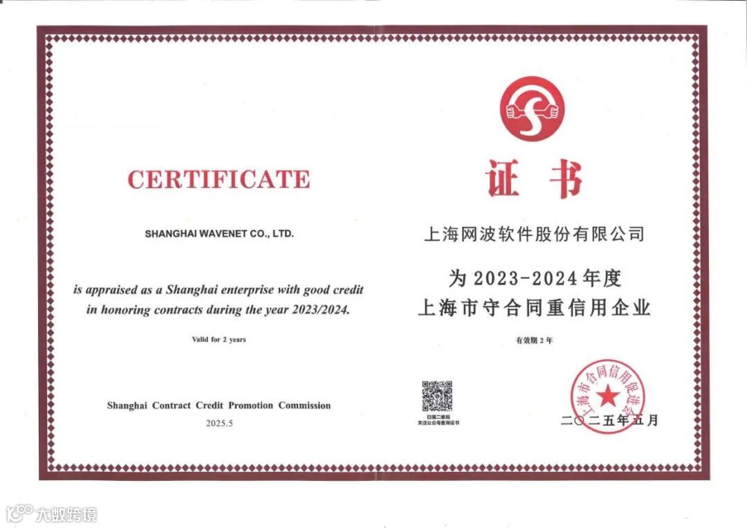 上海网波软件股份有限公司凭借良好的信誉和业绩,荣获“2023-2024年度上海市守合同重信用企业”称号,并获得AAA级合同信用等级认定。