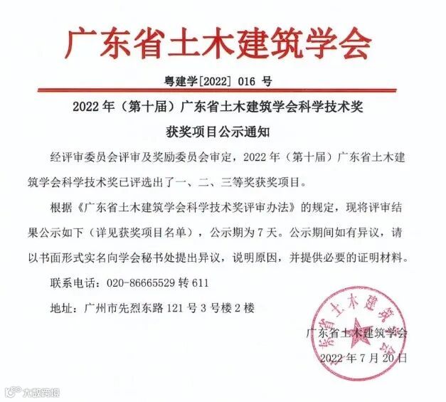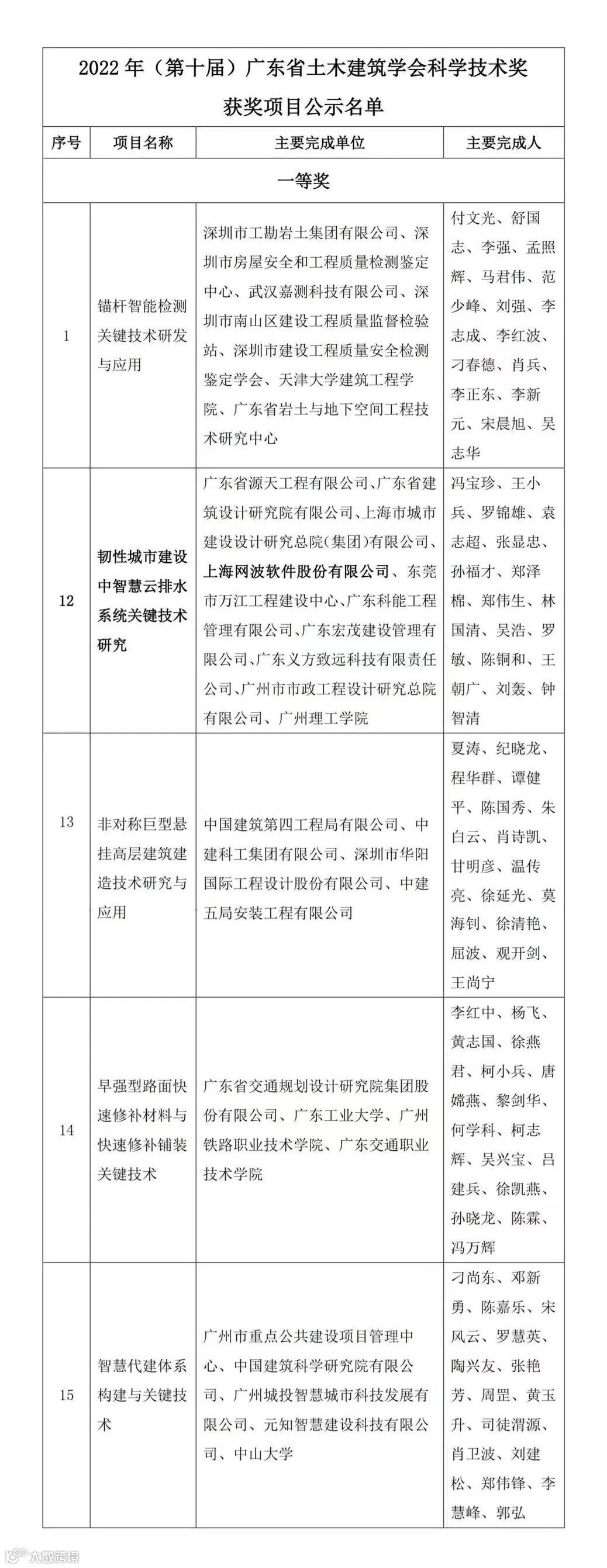 近日,广东省土木建筑学会公示了2022年广东省土木建筑学会科学技术奖获奖项目名单。经申报、初审、网评、答辩和终评等程序层层遴选,网波股份参建的“韧性城市建设中智慧云排水系统关键技术研究”荣获一等奖。