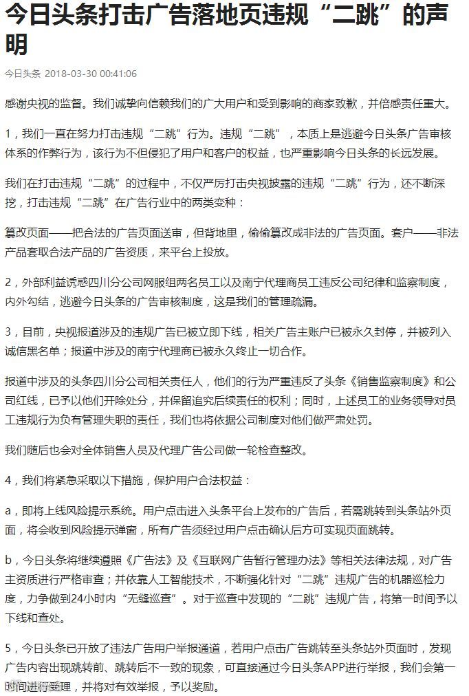 3月29日晚间,今日头条登上央视财经频道《经济半小时》栏目。在这期名为《“今日头条”广告里的“二跳”玄机》的节目中,央视向观众揭露了今日头条“向二三线城市投放虚假广告”以及“广告页违规二跳” 等行为,一时间将这个互联网新贵推向了舆论的风口浪尖。