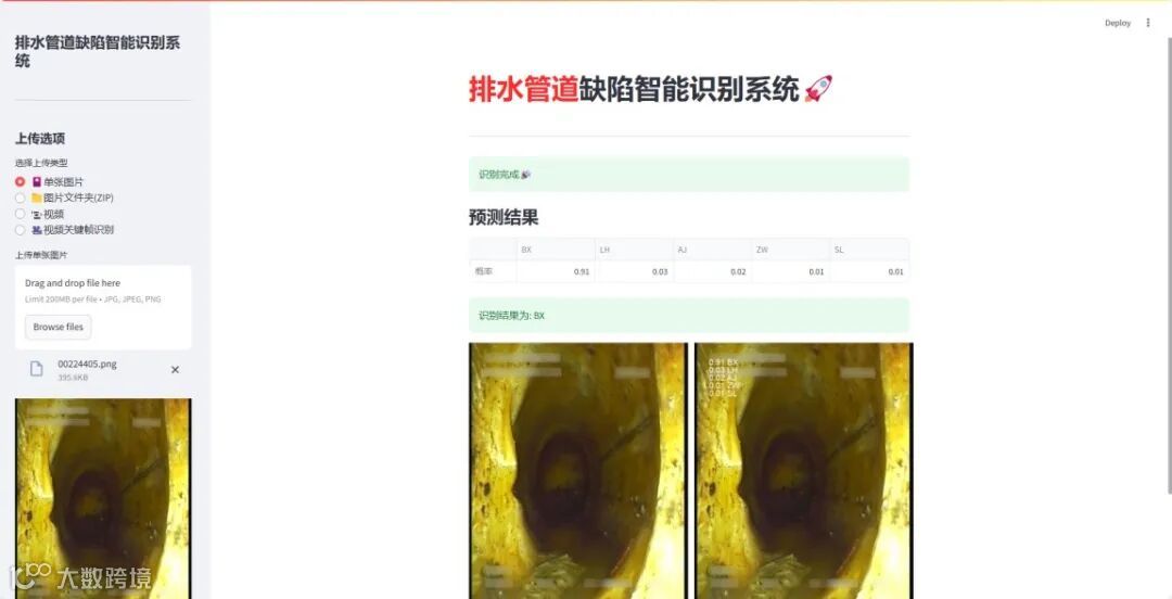 为应对这一挑战,公司基于YOLOv5算法模型研发了智能排水管道缺陷识别系统,通过收集处理约50万张缺陷图片进行模型训练,在常规的缺陷类别下(破裂、沉积、变形、脱节等),模型的准确率达到85%,其他类别下准确率达到70%左右。