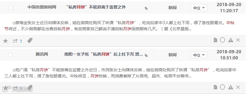 随着月饼舆情的不断升温,一些负面舆情也随之出现,据媒体报道,今年月饼乱象也不少,其中,冰皮月饼更易受微生物污染的报道引发了大量媒体的关注,报道该事件的媒体类型主要集中在新闻上,占比达到60.77%,其中,微信是发布相关文章最多的平台,其次是今日头条。