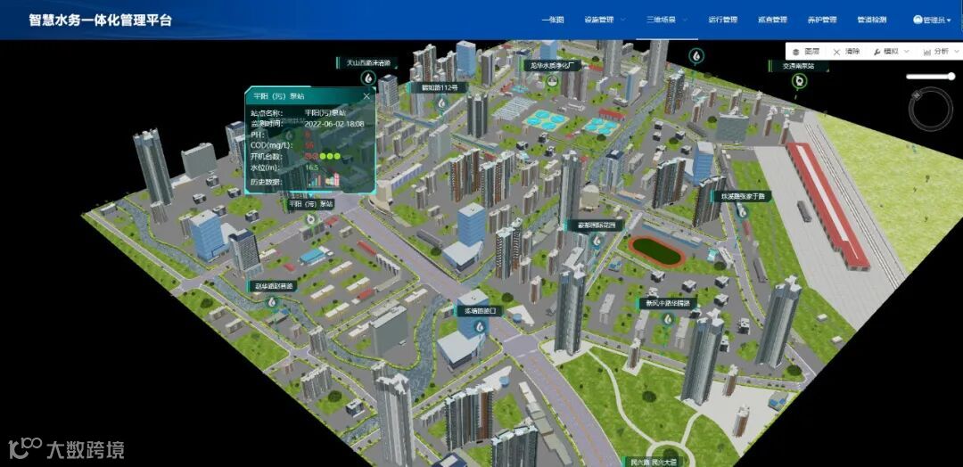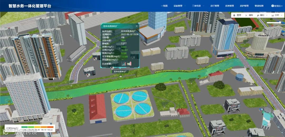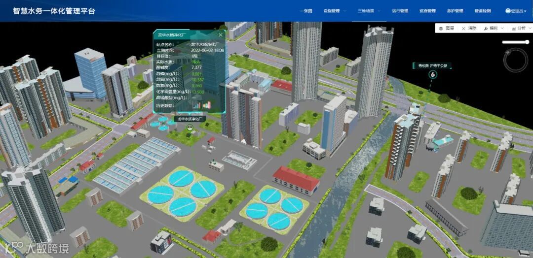 系统监测到某片区污水处理厂出水水质异常,通过三维地图展示该片区污水收集范围,同步提取该片区污水收集及处理设施运行工况、进水水质、水量等相关数据,经后台数据比对分析确定该异常发生频率较高,在汛期尤为严重,其原因为城镇化进程推进,该片区污水收集量超过污水厂处理能力,导致大量污水流入截污箱涵,直接影响出水水质。通过排水运行监管平台可对该片区排水流向、流量进行分析,在孪生场景中通过规划一座调蓄池与污水收集及处理设施联动,模拟在汛期强降雨、非汛期无水两种状态下片区污水收集及处理设施运转效率,并根据调蓄池规模,演练调度预案,通过数字化场景指导工程改造。