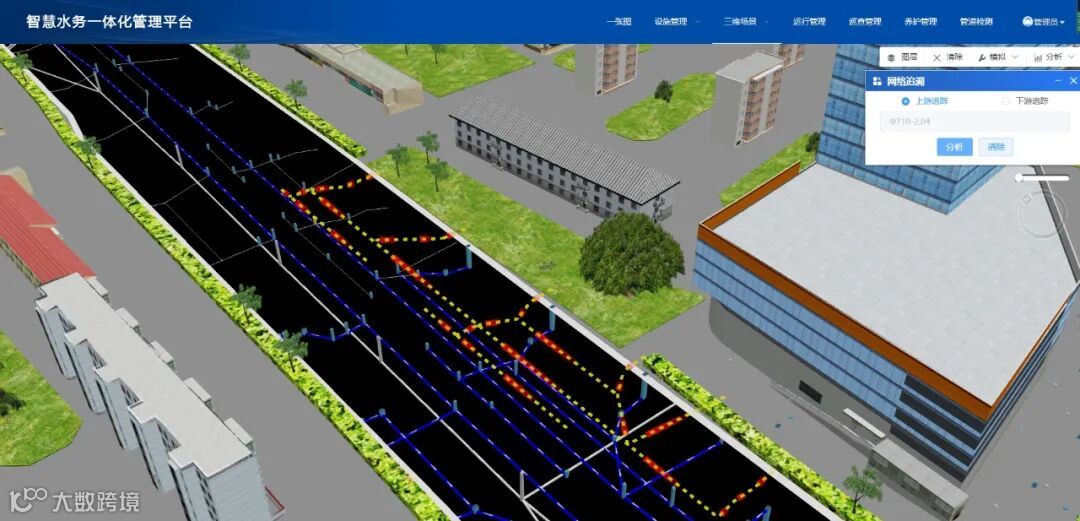 非降雨时段,污水厂进水水质监测指标严重的低于预设值,终端感知点发出告警提示;系统立即锁定告警点、提取周边管网拓扑图、结合三维分析模型,对该区域管网连通性进行分析,对比周边管网监测点水位、流量实测数据,进一步缩小可疑范围;提取问题疑似区域管网养护、探测信息,识别该“病因”属于污水管网开裂,外水入侵、污水外溢导致;通过数字孪生平台快速提取该区域实景模型,结合实测数据,模拟当前管网运行状态、周边污水来源及流向,通过模型分析该段管网上游截断施工改造时,对周边排水户、路面工程、道路交通等带来的影响,辅助用户制定解决方案、规划施工方案。