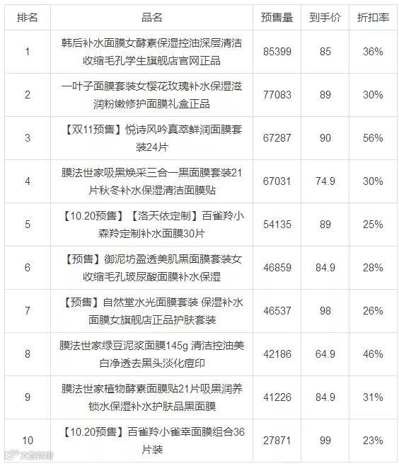 从折扣率看,“膜法世家济州岛三部曲面膜贴24片套装 深层补水保湿水润化妆品”折扣率低到16%,优惠力度最大,但目前预售量还只有516件,而“侯明昊热荐的美即补水保湿黑膜清洁细致毛孔组合正品面膜护肤品”这一款产品预售量和折扣都非常可观,看来明星效应确实给力。