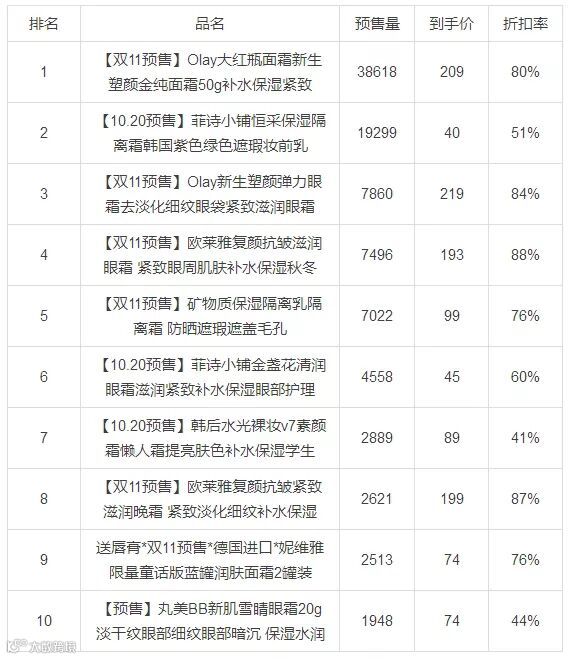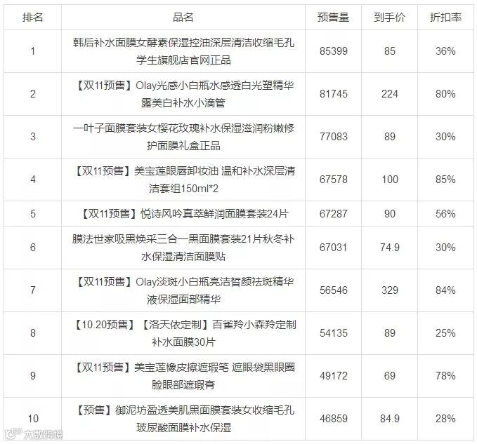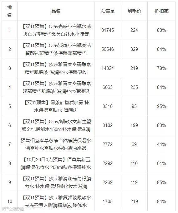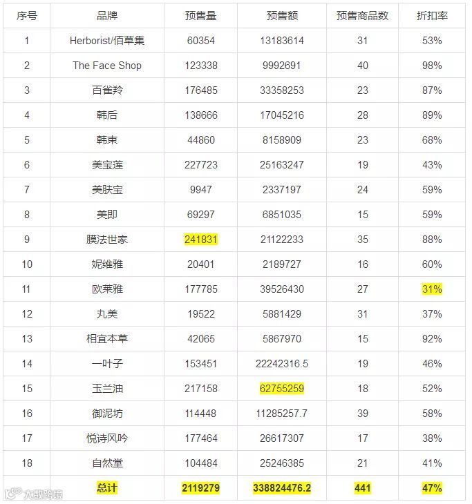 18个品牌中膜法世家拿下了预售总量冠军,而玉兰油则拿下了预售总额的冠军,欧莱雅则是摘得平均折扣率最低的桂冠。