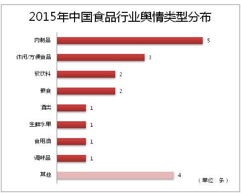 在食品行业类型分布方面,肉制品再次成为舆论关注焦点,尤其是“僵尸肉”、病死猪肉、臭鸡骨等肉制品已经成为人人喊打的对象。另外,方便食品和休闲食品也成为2015年舆论关注的热点,与之相对应的是面包新语“质量门”、郑州“黑盒饭”、脏辣条等热点话题(见图3)。