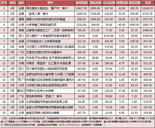为对2015年食品安全舆情进行回顾, 红麦综合新闻、博客、论坛、微博和微信的数量进行加权核算出热度大于100的前20起影响较大的食品安全舆情事件,并从时间、地域、类型以及媒体曝光渠道等维度进行分析对比,以探讨总结2015年食品行业舆情的特点。