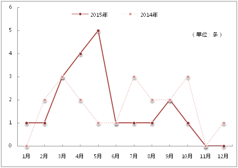 从时间分布来看,2015年3月、4月、5月的食品舆情爆发频繁,从单月数量来看,5月份的重大食品舆情达到了5条,也处在全年高峰期。但从6月份开始,食品热点舆情事件的数量逐渐缓慢下降,到了11月、12月,出现重大食品安全和食品质量的事件数量几乎为零(见图1),当然,也反映出食品安全监管的成效有了显著提高。