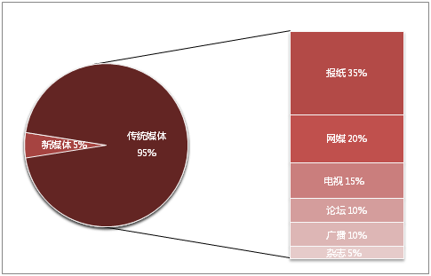 在媒体分布方面,中国食品行业曝光渠道主要以传统媒体为主,占比95%,其中,报纸占比35%;网媒占比20%;电视占比15%(见图4)。值得一提的是,杂志在食品安全曝光方面不是太占优势,远远落后于其他媒体深入一线现场调查,这也可能与自身属性、盈利模式以及现实条件的有关。