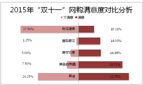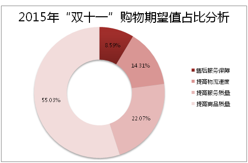 在2015年“双十一”购物过程中,购物者对商品质量的期待也是越来越高,该类问题占比55.03%;其次,对商品的售后服务质量的要求,占比22.07%;再次是对购买商品后的物流速度,占比14.31%。