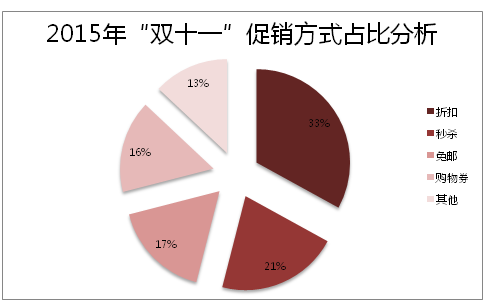 与此同时,在今年的“双十一”的大型电商推出大规模促销活动中,购物者更加倾向于商家折扣促销活动,占比33%;其次,购物者也是利用“秒杀一切”的机会进行疯狂购物,占比21%;再次,免邮服务更让消费者愿意在“双十一”进行网购,其占比17%。
