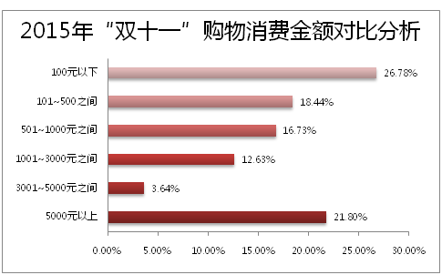 在“双十一”购物期间,消费金额低于100元的人群居多,达到26.78%;其次,消费金额在5000元以上的人群,占比21.80%。从整体上来讲,购物只是一种生活体验方式,消费者购物基本日趋理性,而冲动型消费明显减弱。