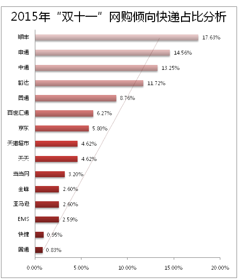据红麦统计,在2015年“双十一”网购中,购物者更加倾向采取顺丰快递,占比17.63%;其次,选择申通快递,占比14.56%,紧随其后依次是中通、韵达、圆通、百世汇通等,占比分别为13.25%、11.72%、8.76%、6.27%。