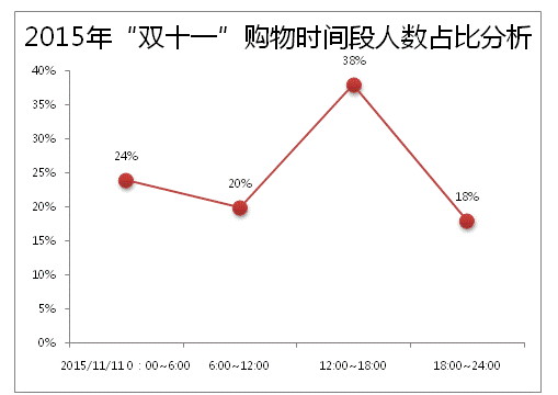 据红麦研究发现,其狂欢背后,商家正是利用“双十一”的机会对自己的商品进行打折优惠以此来推销自己的产品掀起了多次购物潮,并在时间上具有一定的规律性。为此,为了便于统计,我们把时间分为四时段:0:00~6:00、6:00~12:00、12:00~18:00,18:00~24:00,其中当天12:00~18:00之间为全天的购物高峰期,其购物人数比例达到近四成。