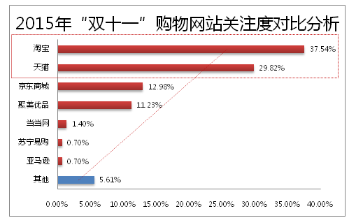 在众多的购物网店中,今年的“双十一”依然以淘宝和天猫为消费主战场,并不断刷新的销售数据。除了淘宝网的关注度在所有的购物网店中最高,占比37.54%;其次为天猫网站,占比29.82%;而占比偏后的网店分别是苏宁易购和亚马逊。